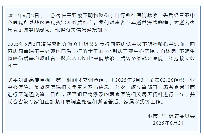 三亞市衛健委通報截圖 6月3日,網友李先生在社交平台發文稱,自己27歲的姐姐“甜甜”(化名)在6月1日晚於三亞旅遊期間被蛇咬傷,經兩家醫院接力救治後,於6月2日清晨搶救無效不幸離世。 李先生稱,當時他的姐姐和男朋友走到一處花壇附近被咬傷,醫院初步診斷為蟲咬傷、不明物咬傷。後來,他的姐姐出現併發症昏厥抽搐,轉院去另一家醫院後身亡。 家屬悲痛之餘,質疑首診的三亞中心醫院存在誤診、延誤治療,以及後續接診的三亞四二五醫院搶救措施不當,認為兩家醫院的處置是導致悲劇的關鍵因素。 對此,三亞市衛健委通報稱,6月2日凌晨零時許,遊客付淇某某步行回酒店途中被不明物咬傷並流血,回酒店簡單消毒並處理傷口後,打的士於1:05到達三亞中心醫院,自述因“不明生物咬傷後,惡心、嘔吐、右下肢麻木1小時”來院就診,後轉至某戰區醫院,經搶救無效死亡。 三亞衛健委於3日凌晨組織三亞中心醫院等部門與患者家屬當面進行了溝通交流。目前,調查組已將涉及的兩家醫院相關病歷資料進行封存,並聯合省級專家組正加緊開展調查處理和逝者善後、家屬安撫等工作。(完) 【編輯:淩玉輝】