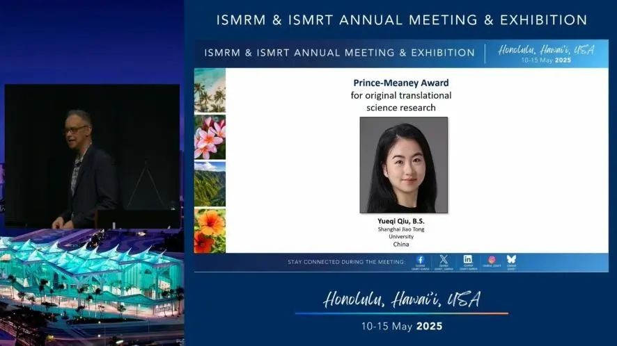 邱月淇獲獎直播截圖 邱月淇來自上海交通大學生物醫學工程學院張志勇老師課題組,該研究團隊所獲獎項名稱為普林斯—米尼轉化科學獎(Prince-Meaney Translational Science Award),是ISMRM 青年科學家獎的三大獎項之一,也是ISMRM頒發的磁共振基礎科學轉化研究領域最高榮譽。評選採用論文評審、大會答辯及專家組終審三重遴選機制,每年僅授予全球範圍內最具臨床應用價值的突破性研究成果。 另據上海“澎湃新聞”報道,邱月淇是一位“00後”博士生。2018年,她考入上海交通大學生物醫學工程學院。本科期間曾榮獲全國大學生數學建模競賽上海賽區本科一等獎、上海交通大學優秀畢業生、校友獎助學金等多項榮譽。出於對醫學影像技術的濃厚興趣,她通過推免直升繼續在上海交大深造。(完) 【編輯:淩玉輝】