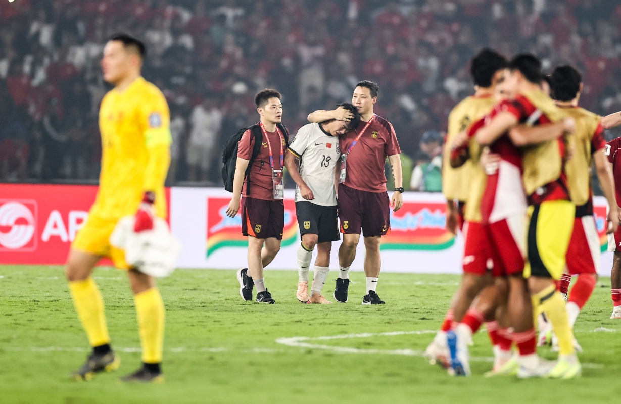 6月5日,中國隊球員張玉寧(右三)與印尼隊守門員奧代羅(右四)在比賽中拼搶。 圖片來源:新華社 前8輪,中國隊2勝6負積6分小組墊底,印尼積9分位列第四,沙特隊積10分排名小組第三。此役戰罷,即便還剩最後一輪,中國隊已提前失去進入前四參加附加賽的可能性,徹底無緣2026美加墨世界杯。 這是中國隊在晉級2002年韓日世界杯之後,連續六屆世界杯衝擊決賽圈失敗。 這也是中國隊時隔68年再次在客場不敵印尼。印尼上次在主場擊敗中國隊要追溯到1957年,彼時印尼在世預賽2比0戰勝中國隊。最近兩次獲勝分別是1971年的2比1和1987年的3比1。這兩場比賽都沒有在印尼舉行。