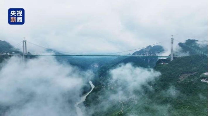 2025年6月5日拍攝的貴州花江峽谷大橋(無人機照片)。圖片來源:新華社 貓道是懸索橋施工時的平台,掛在主纜下方。因工人高空作業時,行走姿態與貓步相似而得名。作為臨時輔助設施,一般在大橋基本完工後拆除。花江峽谷大橋的兩條貓道淨寬4米,單幅總長2264米,最高點距離江面近800米,是目前世界最高的貓道。 花江峽谷大橋因跨越被譽為“地球裂縫”的花江大峽谷而得名,是貴州省六枝至安龍高速的重點控制性工程。公開資料顯示,大橋全長2890米,橋墩最大高度262米,主橋跨徑1420米,於2022年1月正式開工。建成後,這座鋼桁梁懸索橋將成為新的世界第一高橋。 截至目前,大橋主橋下構、引橋、索鞍、主纜、索夾、吊索、鋼桁梁、橋面板、主纜纏絲、主纜防護及主纜檢修道已施工完畢,正在進行護欄安裝、橋面鋪裝及觀光電梯施工。 據貴州廣播電視台融媒體中心10日消息,花江峽谷大橋近日進入路面鋪裝階段,預計一個月左右完成施工。據了解,在進行路面除銹之後,將按照防腐層、防水層、粘結層、澆築式瀝青、面層瀝青,五層依次施工。同時,大橋的觀光電梯、水幕、燈光秀等橋旅融合設施也在同步建設,力爭9月底具備通車條件。 作為全中國唯一沒有平原的省份,貴州近年來已在126萬個山頭間建造了3萬多座橋樑,涵蓋懸索、斜拉、拱式、梁式等各類橋型。目前,全世界前100座高橋,有近一半在貴州。花江峽谷大橋通車後,從六枝到安龍無需再走盤山公路繞行,開車從兩小時縮短至兩三分鐘即可穿越花江大峽谷。(完) 【編輯:石歡歡】