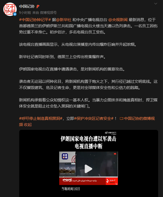 圖源:“中國記協”微博賬號 中國記協發文稱,襲擊者無論冠以何種名目,將新聞機構置於炮火之下,其行徑已越過文明底線。這不僅摧毀建築、危及記者生命,更是對全球媒體安全性和公信力的踐踏。新聞機構承載著公眾知情權這一基本人權。當暴力企圖抹殺和掩蓋真相時,捍衛媒體安全就是阻止社會墜入黑洞的關鍵閘門。 中國記協呼籲,停止製造真相黑洞,立即保護衝突區記者安全。 當地時間16日,位於首都德黑蘭的伊朗伊斯蘭共和國廣播電視台大樓當天遭以色列襲擊。一名員工因傷勢過重不幸身亡。初步估計,多名電視台員工受傷。該電視台直播畫面顯示,從電視台演播室內傳出爆炸巨響並升起濃煙。 在遭襲約1小時後,伊朗國家電視台恢復直播。初步估計,多名電視台員工在此次襲擊中受傷。 伊朗國家電視台台長16日晚發表聲明稱,電視台遭到以軍的“殘忍襲擊”表明,“以方已將國家媒體作為其戰略打擊的目標”。(完) 【編輯:彭玉婷】