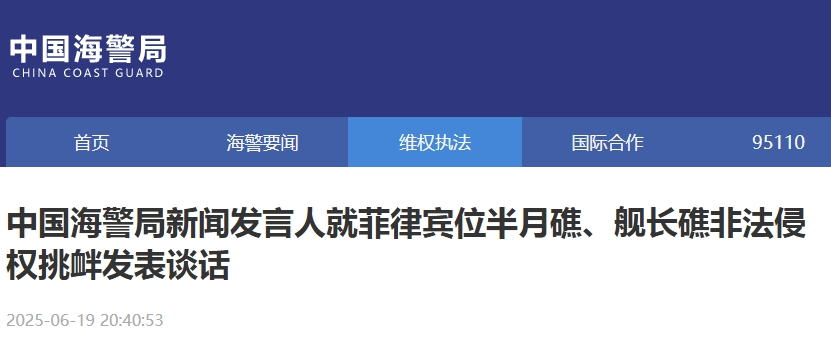 (中國海警局網站截圖) 發言人指出,中國對包括半月礁、艦長礁在內的南沙群島及其鄰近海域擁有無可爭辯的主權,菲公務船打著所謂“護漁”幌子非法侵權挑釁,持續破壞南海穩定。中方正告菲方,任何侵權伎倆都是徒勞。中國海警將依法在中國管轄海域常態維權執法,堅決維護領土主權和海洋權益。 (完) 【編輯:淩玉輝】
