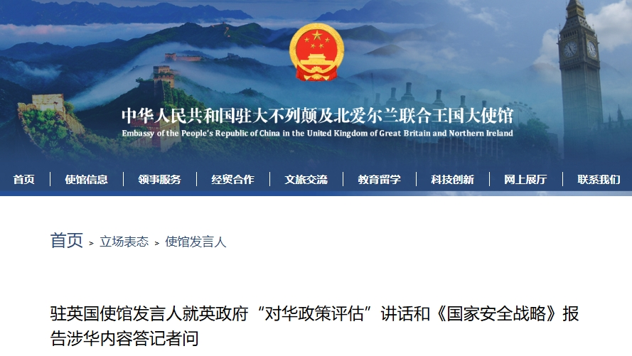 (圖源:中國駐英國大使館網站截圖) 24日,英國外交發展大臣拉米在英議會下院就“對華政策評估”發表講話,一方面強調中國的重要性,表示英方應加強同中方接觸與合作,另一方面繼續誣稱中國在安全領域給英國帶來多重威脅,並就涉台、涉港、南海、人權等問題說三道四。同日英方發布的《國家安全戰略》報告也多次提到中國。 中國駐英國使館發言人25日就此表示,事實充分證明,中國始終是世界和平的建設者、全球發展的貢獻者、國際秩序的維護者。中國的發展不對任何國家構成挑戰或威脅,而只會給世界各國帶來共同發展的機遇。所謂中國對英進行間諜活動、網絡攻擊、跨國鎮壓等指責純屬無中生有、惡意誹謗。涉台、涉港、人權等問題純屬中國內政,任何外部勢力無權干涉。中方維護國家領土主權和海洋權益的決心堅定不移,決不允許任何外部勢力挑釁滋事。 發言人說,我們奉勸英方認清形勢、端正心態,徹底摒棄冷戰思維和意識形態偏見。只有秉持正確對華認知,堅持相互尊重、開放合作,中英各領域對話交流才能順利進行,兩國關係才能行穩致遠。(完) 【編輯:淩玉輝】