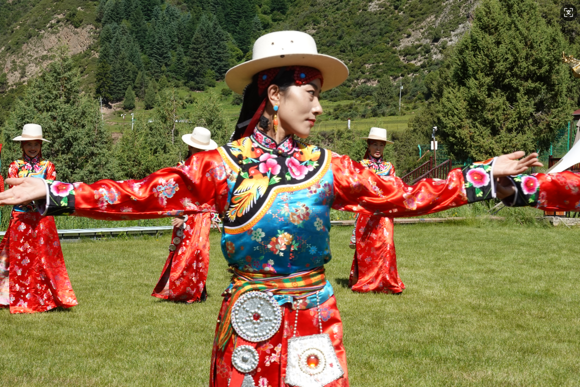 (香港中通社記者 譚暢攝) 而藏族女子們則身穿“三格毛”服飾款款起舞。卓尼當地女子通常將頭髮梳成三根粗大的長辮子,“三格毛”服飾也由此得名。服裝顏色艷麗多彩,由長袍及馬甲(當地稱“庫多”)兩部分構成,婦女多用藍色、深綠色做長袍,紫紅色或大紅色做“庫多”;少女則用深綠色或粉紅色做長袍,紫紅色做“庫多”。 在她們眼中,藍色是天空的顏色,而綠色是大地的顏色。“三格毛”服飾顏色的選擇,同樣也體現出這一古樸民族崇尚自然、天人合一的審美情懷。高原之上的人文魅力,由此得到更深刻的體現。(完) 【編輯:譚暢】