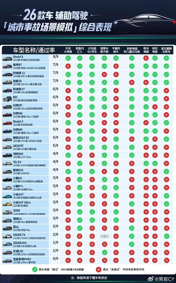 在城市事故場景模擬里,Model X通過率達到了8/9,在開進大轉盤、轉盤內匯入等多個項目上表現出色,是參測車型中通過率最高的。 智界R7、阿維塔12等車型通過率也較高,但和Model X相比,在部分細節場景的處理上仍有差距。 此次實測結果反映出,雖然各車企都在大力發展輔助駕駛技術,但目前還沒有一款系統能做到萬無一失。 不過特斯拉憑藉相對較高的通過率和在不同場景下較為均衡的表現,成為了實測中的佼佼者。