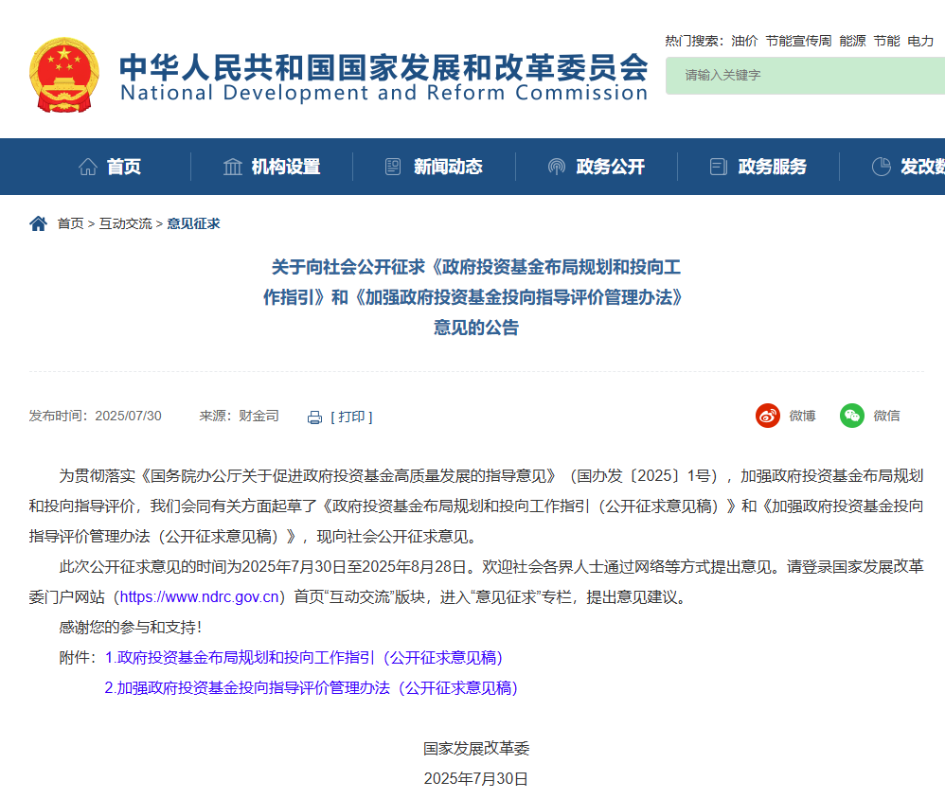 中國發改委截圖 兩文件分別為《政府投資基金布局規劃和投向工作指引(公開徵求意見稿)》及《加強政府投資基金投向指導評價管理辦法(公開徵求意見稿)》,公開徵求意見由即日起至8月28日。 《指引》明確,政府投資基金不得變相增加地方隱性債務,除併購重組、定向增發、戰略配售外,不得從事公開交易股票投資、衍生品交易或為非被投資企業提供擔保,並需控制對單個企業的投資金額或比例上限。基金應遵循全國統一大市場要求,不以招商引資為目的,鼓勵降低返投比例,避免盲目投資存在結構性矛盾的產業,支持企業兼併重組與技術升級。 據介紹,投資重點包括四方面:一、符合國家級產業目錄的鼓勵類產業;二、國家級基金聚焦現代化產業升級、關鍵技術攻關及跨區域重大項目,與地方基金聯動形成合力;三、地方基金因地制宜,聚焦特色優勢產業及科創企業孵化;四、聚焦高端產能與技術創新,支持傳統產業改造、新興產業培育及未來產業布局,解決“卡脖子”難題。 《管理辦法》並提出建立覆蓋基金全流程的評價指標體系,涵蓋政策取向符合性、投向布局優化及政策執行能力,並設置投向領域負面行為清單。對不符合指引的存量基金,原則上存續期滿後退出,鼓勵整合重組。(完) 【編輯:彭玉婷】