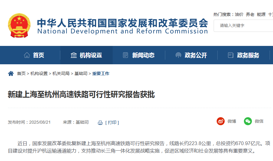 香港中通社8月21日電 8月21日,中國國家發展改革委官網發布消息,近日,國家發展改革委批復新建上海至杭州高速鐵路可行性研究報告,線路長約223.8公里,總投資約670.97億元人民幣。