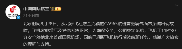 香港中通社8月28日電 據中國國際航空微博消息,北京時間8月28日,從北京飛往法蘭克福的CA965航班客艙氧氣面罩系統出現故障,公司決定返航,飛機於11時30分安全落地北京首都國際機場。