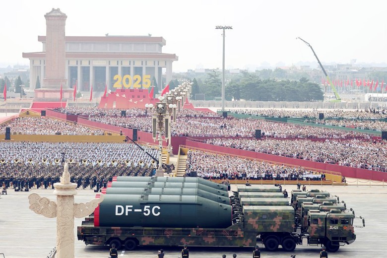 巨浪-3導彈是巨浪-2的改進版,9月3日在閱兵式上亮相吸引民眾紛紛拿起手機拍照。新華社圖 作為中國新一代戰略核導彈,東風61預計能攜帶多枚熱核分導式核彈頭,最大射程可突破1萬2000公里,實現全球大部分地區戰略核打擊能力,性能遠超東風41。巨浪-3導彈則是巨浪-2的改進版,能運載多個彈頭,包括核彈頭,射程1萬2000公里。美軍曾警告,巨浪-3可能使美國本土處於中國導彈射程範圍內。 ②東風-5C液體洲際戰略核導彈