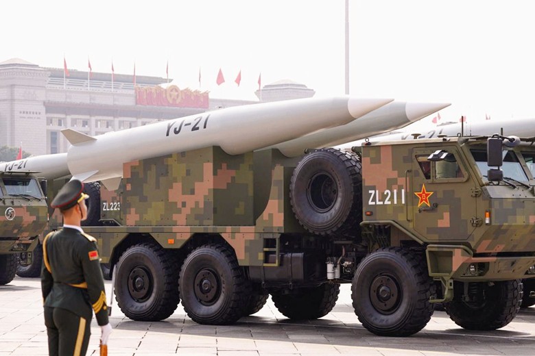 殲-20S是全球首款雙座隱身戰機。央視新聞視頻截圖 殲-20S是全球首款雙座隱身戰機。有別於殲-20其他型號,它最顯著的不同是雙座和座艙機背稍微隆起。前座飛行員保持戰機飛行與空戰主控權,後座飛行員則可操控無人機僚機的電子戰系統,執行空對地精確打擊任務。這種分工模式使殲-20S既能作為空優作戰平台,又能化身無人作戰指揮中樞。若加上無人機群的協同作戰,可大幅提升戰場信息處理效率,使殲-20S的作戰效能遠超其他單座五代機。 ④“鷹擊-21”高超音速反艦彈道導彈