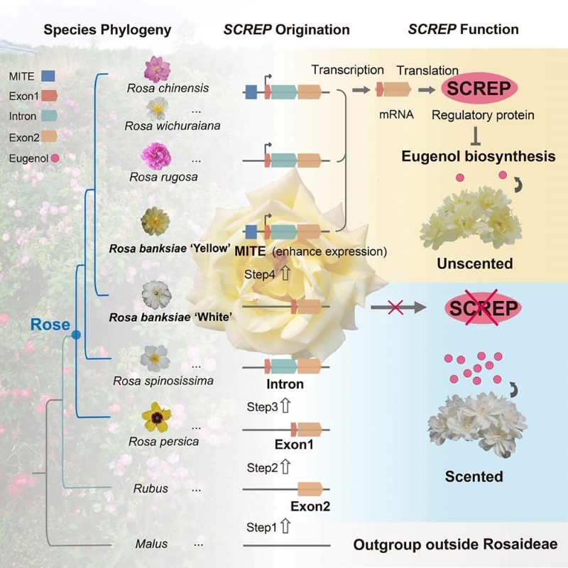 新起源的譜系特異基因的進化驅動了玫瑰香氣的多樣化。圖源:華中農業大學 大約6300萬年前,同為薔薇亞科物種的樹莓里驟然出現了一段無功能的“非編碼DNA”。直至1600萬年前,隨著薔薇屬物種植物的演化,這些零散片段逐步演變為可編碼蛋白質的完整基因框架。而一個名為MITE的“跳躍基因”插入其啟動區,如同安裝“能量電池”,促使SCREP增強表達,最終影響了薔薇屬植物花香。 團隊對38種涵蓋野生種、古老栽培種及現代栽培種的薔薇植物進行基因測序與香氣成分分析發現:SCREP基因普遍存在於進化程度較高或經人工選育的薔薇品種中。缺少該基因或其啟動區域未插入MITE“跳躍基因”(無“能量電池”)的植株,往往能釋放更濃鬱的丁香酚香氣。這表明,SCREP基因的有無及表達強度,是塑造薔薇屬植物多樣花香“性格”的核心因素之一。 該發現不僅為月季花香性狀的定向調控提供了理論依據,更具備廣闊的合成生物學應用潛力:未來,有望突破傳統依賴已有基因進行改良組裝的技術局限,通過從頭創造新基因的方式,精準改良植物性狀。(完) 【編輯:彭玉婷】