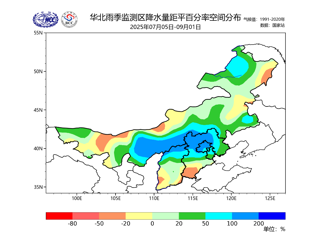 7月5日至9月1日華北雨季監測區降水量距平百分率空間分布 圖源:中國氣象局 中國氣象局國家氣候中心監測顯示,今年華北雨季於7月5日開始,較常年偏早13天,結束時間較常年偏晚16天。雨季持續時間較常年偏長29天,與1973年、2021年並列,成為1961年以來持續時間最長的雨季;雨季累計降水量達356.6毫米,較常年平均值偏多161.1%,創1961年以來歷史新高。