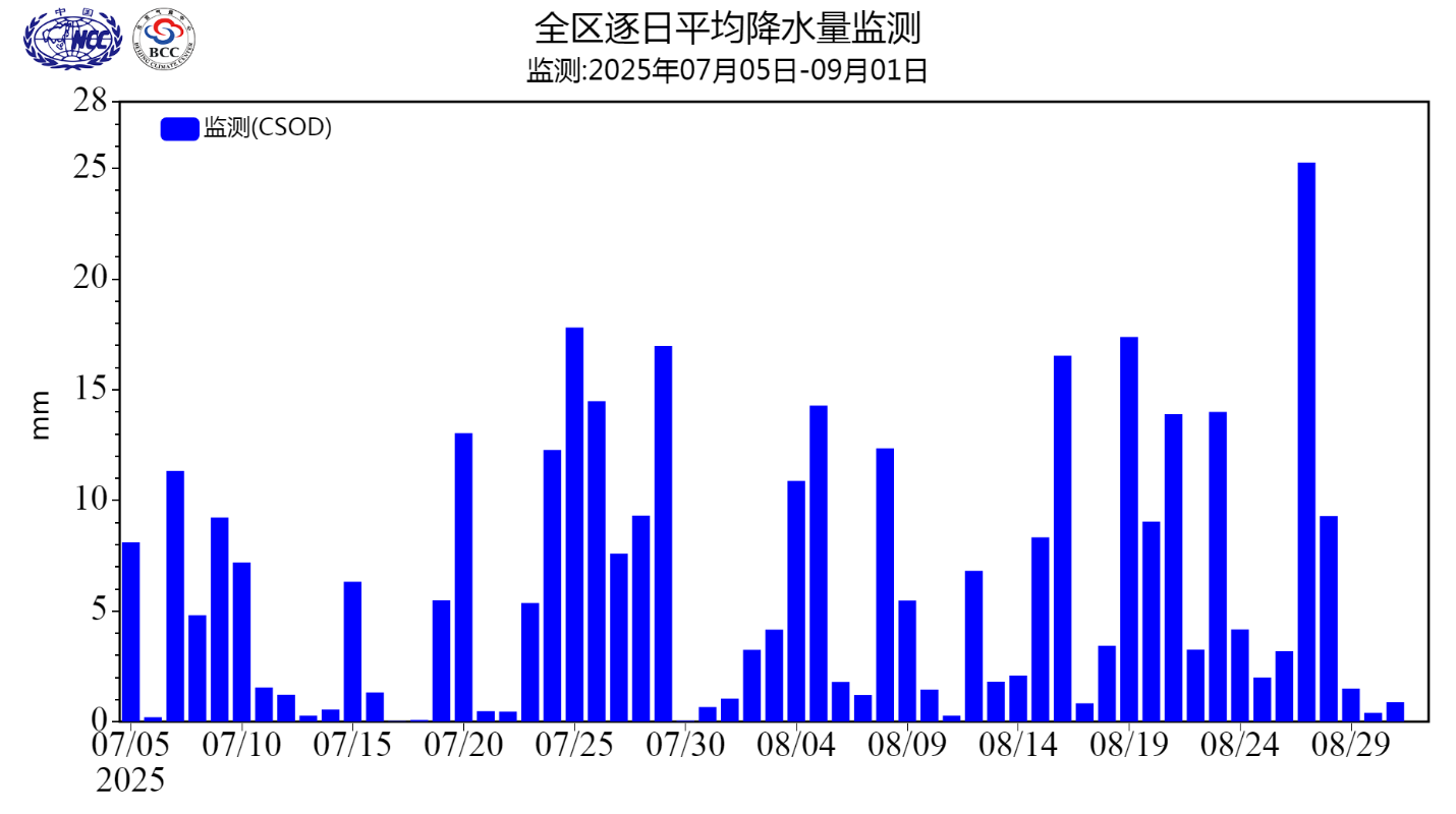 7月5日至9月1日華北雨季監測區域逐日平均降水量監測 圖源:中國氣象局 從空間分布看,北京、天津北部、河北西北部、山西北部和內蒙古西南部等地降水偏多1倍至2倍,僅河北西南部、山西西南部局部地區降水偏少。在氣溫方面,監測區大部氣溫較常年同期偏高,平均氣溫達24.8℃,位列1961年以來歷史第四位。 另據中國天氣網9月5日消息,9月5日至6日,冷暖氣流交匯下還將有大範圍降雨出現,陝西、湖北、四川、貴州等地部分地區有暴雨或大暴雨。(完) 【編輯:彭玉婷】