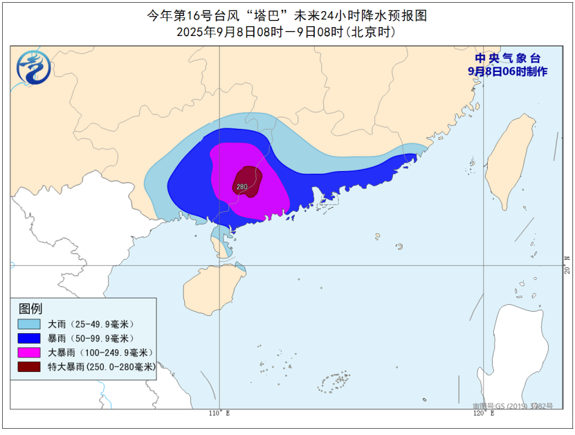 香港中通社9月8日電 今年第16號颱風“塔巴”(強熱帶風暴級)的中心已於8日8時50分前後在廣東省台山市登陸,登陸時中心附近最大風力11級(30米/秒)。廣東省氣象部門預計,受其影響,9月7日夜間至9日白天,廣東陸地將有一次嚴重風雨過程。