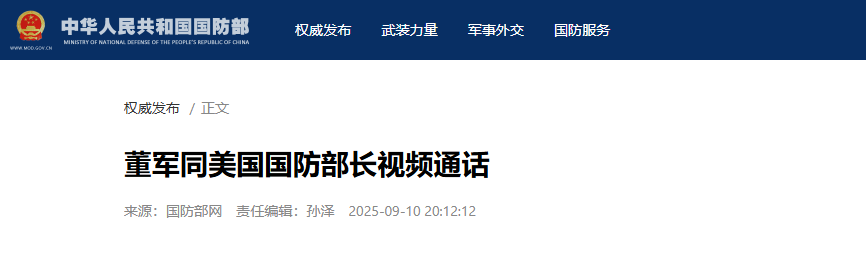 香港中通社9月10日電  中國國防部長董軍9日晚應約同美國國防部長赫格塞思視頻通話。
