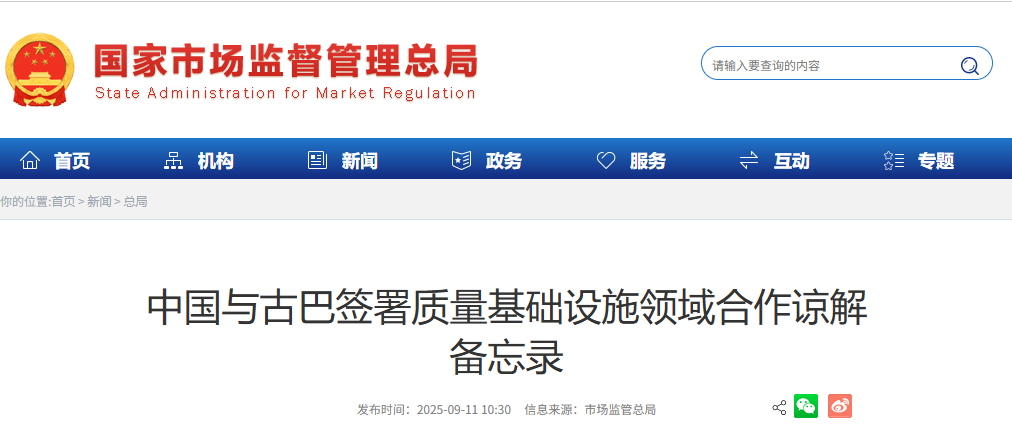圖源:中國國家市場監督管理總局官網截圖 據介紹,通過簽署該合作諒解備忘錄,中古雙方將持續完善質量基礎設施領域合作機制,加強信息交流與共享,推動計量、標準化和合格評定等質量基礎設施領域的交流與合作,便利雙邊貿易,助推加快構建中古命運共同體。 古巴是西半球唯一的社會主義國家,也是第一個與中華人民共和國建交的拉美國家。1960年9月,中古正式建立外交關係。2025年1月1日,古巴成為金磚國家夥伴國。長期以來,美國對古巴實施封鎖制裁。(完) 【編輯:彭玉婷】