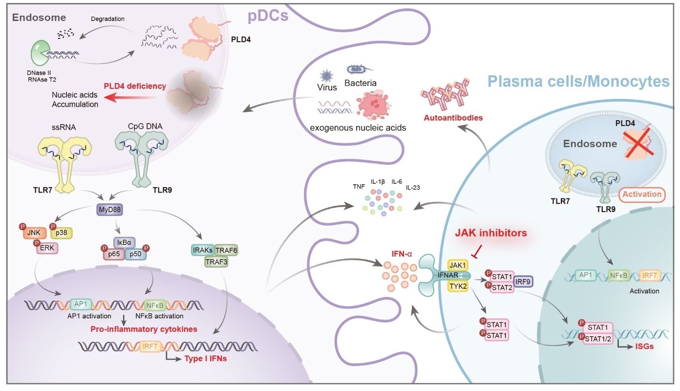 PLD4缺失致使pDCs、B細胞持續活化TLR7/9信號通路,引發自身免疫。圖源:浙江大學 浙江大學良渚實驗室、國家腎臟疾病臨床醫學研究中心劉志紅院士,浙江大學良渚實驗室俞曉敏研究員,以及浙江大學良渚實驗室、浙江大學生命科學研究院周青教授為論文共同通訊作者。 系統性紅斑狼瘡是一種臨床表現異質性高、多系統受累的自身免疫性疾病,患者常伴有特異性自身抗體陽性及補體激活。這一疾病的確切發病機制尚未完全明確,遺傳因素與免疫異常在其發生發展中起關鍵作用。 據介紹,系統性紅斑狼瘡是一種異質性很強的自身免疫疾病,不管是臨床症狀還是遺傳機制,都存在很大的個體化差異。這對認識其發病機制構成了極大挑戰。 研究團隊通過全外顯子組測序,發現5例系統性紅斑狼瘡腎炎患者存在PLD4基因突變,這種基因存在於人體樹突狀細胞、B細胞和單核細胞中,PLD4基因突變屬於隱性遺傳。 研究團隊進一步發現,這一基因突變引發了機體長期炎症及自身免疫的致病機制,並通過小鼠實驗證實,某些靶向治療藥物JAK抑制劑可顯著緩解缺陷小鼠體重下降、自身抗體產生及組織炎症等症狀,可為攜帶PLD4突變的系統性紅斑狼瘡患者提供潛在的精準治療策略,也為未來開展基於基因分型的個體化治療提供了重要依據。(完) 【編輯:彭玉婷】