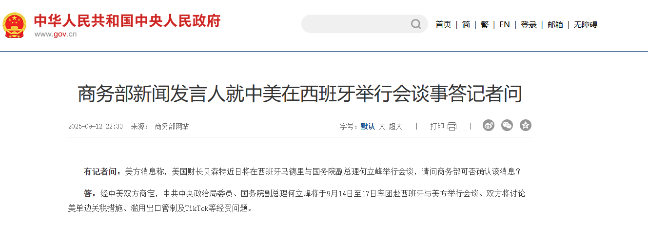 圖片來源:中國商務部網站截圖 有記者問:美方消息稱,美國財長貝森特近日將在西班牙馬德里與國務院副總理何立峰舉行會談,請問商務部可否確認該消息? 發言人答:經中美雙方商定,中共中央政治局委員、國務院副總理何立峰將於9月14日至17日率團赴西班牙與美方舉行會談。雙方將討論美單邊關稅措施、濫用出口管制及TikTok等經貿問題。(完) 【編輯:林曉惠】