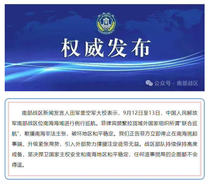 香港中通社9月14日電  南部戰區新聞發言人田軍里空軍大校14日表示,9月12日至13日,中國人民解放軍南部戰區位南海海域進行例行巡航。菲律賓頻繁拉攏域外國家組織所謂“聯合巡航”,散播南海非法主張,破壞地區和平穩定。