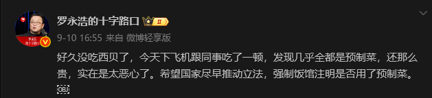 圖源:“羅永浩的十字路口”微博賬號截圖 日前,中國知名科技創業者羅永浩吐槽西貝“全是預製菜且貴”,西貝創始人賈國龍強勢回應,堅稱“沒有一道菜是預製菜”,並宣布自9月12日起全國370家門店允許消費者參觀菜品制作過程。雙方唇槍舌劍,引起更大範圍對預製菜問題的討論。 據中新經緯報道,北京市豐台區的西貝六里橋旗艦店是西貝在北京最大門市,該門市共上下3層,除1層散客就餐區外,2、3樓還有34個包廂。據該店工作人員說,9月13日中午,門店等位散客只排到37桌,相比上周六中午約140桌,客流減少七成以上。 除了堂食客流下降外,門店當天外賣訂單降幅也有12.8%。 針對“速凍西蘭花”爭議,廚師長向記者介紹,門店食材都是公司總部統一配送的,有機蔬菜蟲害會比較多,採用統一採購、統一速凍方式,能保證食材的安全和菜品穩定性。 廚師長還提到,“速凍西蘭花”到店後,通常兩三天時間能消耗完。門店內所用蔬菜只有西蘭花是速凍的,其他都是新鮮的。 據報道,中國衛健委主導的《預製菜食品安全國家標準》草案即將公開徵求意見,屆時餐飲門店是否使用、如何使用預製菜,將首次納入信息披露範疇。(完) 【編輯:彭玉婷】