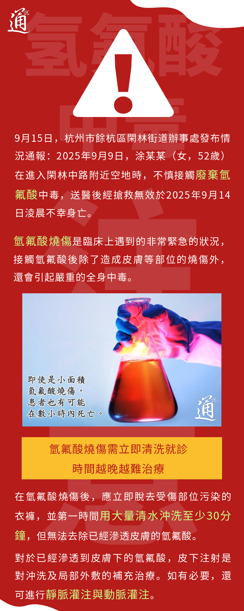 香港新聞網9月16日電 9月15日,杭州市餘杭區閑林街道辦事處發布情況通報,具體如下: 2025年9月9日,涂某某(女,52歲)在進入閑林中路附近空地時,不慎接觸廢棄氫氟酸中毒,送醫後經搶救無效於2025年9月14日凌晨不幸身亡。 公安機關在接警後第一時間介入調查;生態環境部門已按規範完成現場無害化處置;街道正在全力推進善後處置工作。目前,事發原因正在進一步調查中。對涂某某的不幸離世,我們深表痛心和惋惜,向當事人家屬表示深切慰問。 據新華社此前報道,氫氟酸是氟化氫氣體的水溶液,無色透明,有刺激性氣味,具有極強的腐蝕性,能夠腐蝕金屬、玻璃和含硅的物體 不慎接觸氫氟酸(俗稱“化骨水”)該如何處理?香港新聞網為讀者整理如下建議: