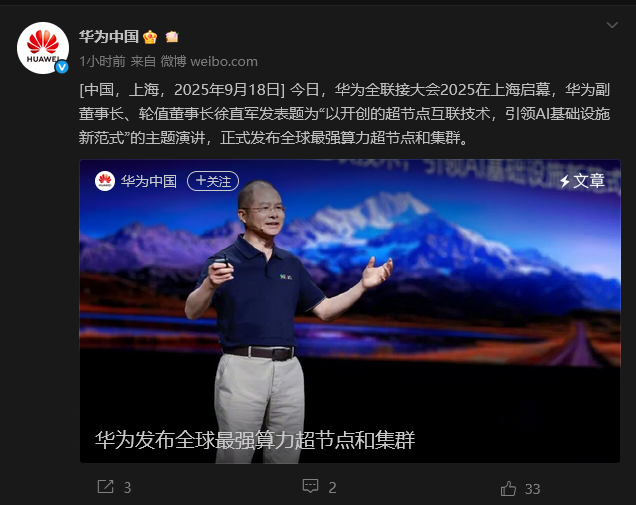圖源:“華為中國”微博賬號截圖 所謂“超節點”,即是將一台或多台高性能AI伺服器作為節點,通過高速互聯網絡技術連接成一個規模更大、性能更強的超級計算節點,以應對消耗算力的AI大模型計算工作。 華為副董事長、輪值董事長徐直軍當天在華為全聯接大會上介紹,這兩款超節點產品分別支持8192及15488張昇騰卡,在卡規模、總算力、內存容量、互聯帶寬等關鍵指標上全面領先,在未來多年都將是全球最強算力的超節點。 同時,基於超節點,華為發布了全球最強超節點集群,分別是Atlas 950 SuperCluster和 Atlas 960 SuperCluster,算力規模分別超過50萬卡和達到百萬卡,是當之無愧的全世界最強算力集群。 此外,華為率先把超節點技術引入通用計算領域,發布全球首個通用計算超節點TaiShan 950 SuperPoD,結合GaussDB分布式數據庫,能够徹底取代各種應用場景的大型機和小型機以及Exadata數據庫一體機,將成為各類大型機、小型機的終結者。 華為超節點Atlas 950 SuperPoD預計於今年四季度上市,Atlas 960 SuperPoD預計2027年四季度上市。 就昇騰芯片研發進展,徐直軍當天表示,未來三年,華為已經規劃了昇騰多款芯片,包括950PR,950DT以及昇騰960和970。其中950PR2026年第一季度對外推出,該芯片採取了華為自研HBM(高帶寬內存)。(完) 【編輯:彭玉婷】