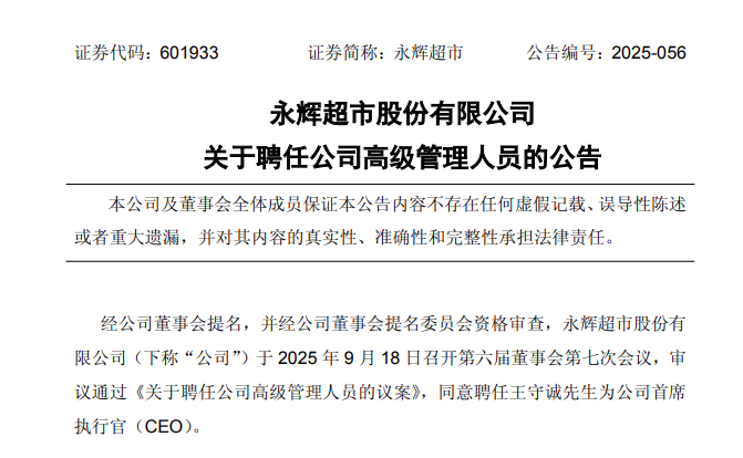 香港中通社9月19日電 中國民營企業永輝超市(601933.SH)日前發布公告稱,聘任現年34歲的王守誠為公司首席執行官(CEO)。分析指,王守誠主導胖東來學習項目調改小組,牽頭運營標準體系建設,推動門店品質升級。該任命標誌永輝堅定“胖東來模式”轉型決心。