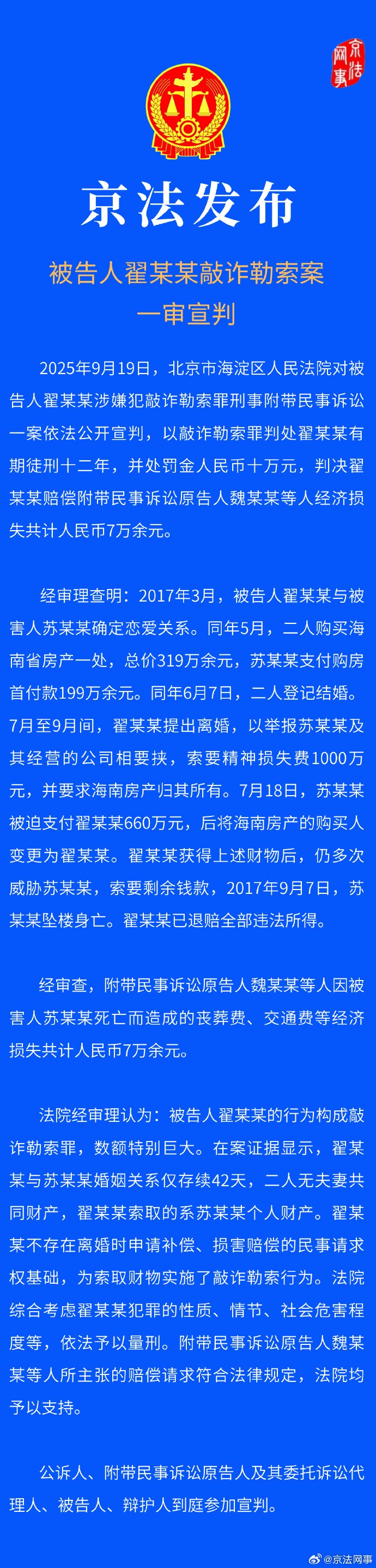 圖源:京法網事 法院經審理查明:2017年3月,被告人翟某某與被害人蘇某某確定戀愛關係。同年5月,二人購買海南省房產一處,總價319萬餘元,蘇某某支付購房首付款199萬餘元。同年6月7日,二人登記結婚。7月至9月間,翟某某提出離婚,以舉報蘇某某及其經營的公司相要挾,索要精神損失費1000萬元,並要求海南房產歸其所有。7月18日,蘇某某被迫支付翟某某660萬元,後將海南房產的購買人變更為翟某某。翟某某獲得上述財物後,仍多次威脅蘇某某,索要剩餘錢款,2017年9月7日,蘇某某墜樓身亡。翟某某已退賠全部違法所得。 經審查,附帶民事訴訟原告人魏某某等人因被害人蘇某某死亡而造成的喪葬費、交通費等經濟損失共計人民幣7萬餘元。 法院經審理認為:被告人翟某某的行為構成敲詐勒索罪,數額特別巨大。在案證據顯示,翟某某與蘇某某婚姻關係僅存續42天,二人無夫妻共同財產,翟某某索取的係蘇某某個人財產。翟某某不存在離婚時申請補償、損害賠償的民事請求權基礎,為索取財物實施了敲詐勒索行為。法院綜合考慮翟某某犯罪的性質、情節、社會危害程度等,依法予以量刑。附帶民事訴訟原告人魏某某等人所主張的賠償請求符合法律規定,法院均予以支持。(完) 【編輯:彭玉婷】