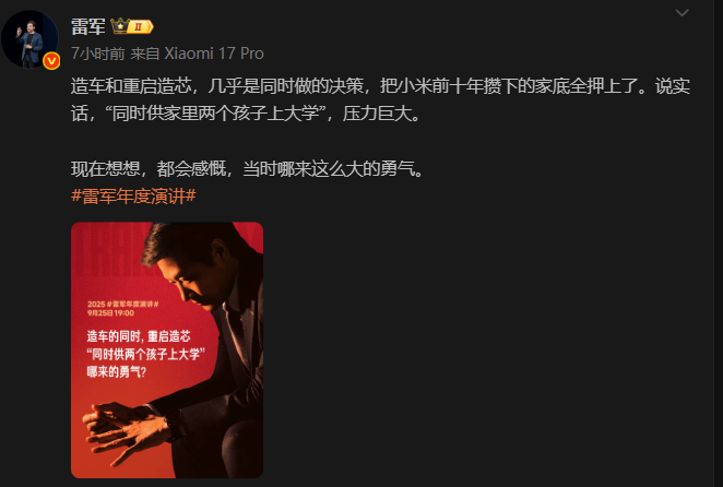 圖源:“雷軍”微博賬號截圖 雷軍用了一個比喻,“同時供家里兩個孩子上大學”,壓力巨大。他表示,“現在想想,都會感慨,當時哪來這麼大的勇氣”。 據悉,小米將於25日晚舉辦雷軍年度演講,主題為“改變”,屆時將揭秘小米玄戒芯片和小米汽車背後的故事。 小米汽車於2024年4月開啟首批交付,僅用七個半月時間便在2024年11月達成首個10萬輛交付里程碑。今年8月1日,雷軍微博發文稱,2025年7月,小米汽車交付量超過3萬台。 今年5月,小米自主研發設計的首款3納米旗艦處理器“玄戒O1”、首款長續航4G手表芯片“玄戒T1”正式發布。據悉,玄戒O1已開始大規模量產。玄戒O1採用目前業界最先進的第二代3納米工藝製程,其綜合性能達到國際旗艦芯片第一梯隊水準。(完) 【編輯:彭玉婷】