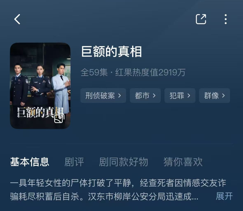圖源:短劇APP頁面截圖 業界人士認為,《巨額的真相》這部微短劇深度融合了法律知識,成為反詐宣傳的有力載體,將微短劇的傳播優勢轉化為普法效能。 事實上,中國微短劇市場的提質發展與官方的扶持、引導相輔相成。目前,中國已有14個省(區、市)出台了微短劇發展扶持政策,通過資源整合、創作引導等方式推動微短劇高質量發展。此外,中國還組織實施“微短劇+”行動計劃,開展“跟著微短劇來學法”“微短劇里看非遺”等活動,既促進拓展微短劇題材,也推動微短劇賦能其他行業。 中國國家廣播電視總局近日披露,中國正在制訂《微短劇管理辦法》;對微短劇開展專項治理和常態化監管,及時處置違規節目;並不斷細化管理,對觀眾反映強烈的問題,如“雷人”劇情、“霸總”人設、片名嘩眾取寵等問題,及時進行糾偏。(完) 【編輯:彭玉婷】