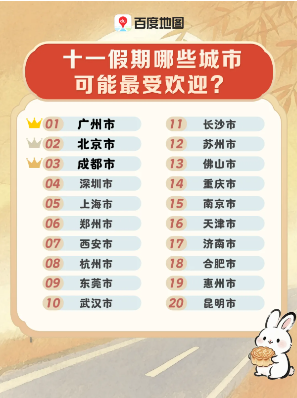 香港新聞網9月30日電 今年中國“十一”國慶中秋長假,不少人啟動假期出遊模式。 途牛的報告顯示,國慶中秋假期出遊的酒店、機票預訂,也都在本周進入集中預訂的又一個高峰。其中,境內遊方面,自駕遊和自由行產品預訂出遊人次周環比增長超60%;跟團遊產品預訂出遊人次周環比增長超50%。 百度地圖聯合交通運輸部公路科學研究院、交通運輸部路網監測與應急處置中心、中路高科集團、同程旅行發佈《2025十一出行數據預測報告》,報告顯示,廣州、北京、成都、深圳及上海成為十一黃金周最受歡迎的城市。