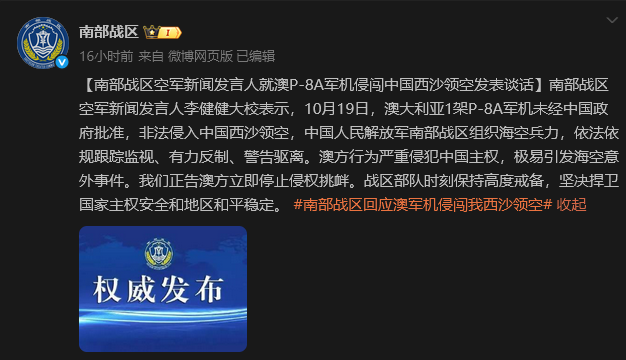 香港中通社10月20日電 中國人民解放軍南部戰區空軍新聞發言人李健健大校20日表示,10月19日,澳大利亞1架P-8A軍機未經中國政府批准,非法侵入中國西沙領空,中國人民解放軍南部戰區組織海空兵力,依法依規跟蹤監視、有力反制、警告驅離。