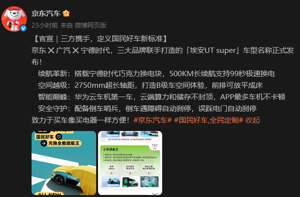 圖源:“京東汽車”微博賬號截圖 據介紹,新車搭載全球首款“廣汽華為雲車機”系統,具備強大智能交互能力,並配備2750mm超長軸距,提升車內空間舒適性。在安全科技方面,“埃安UT super”為同級唯一配備“倒車哨兵”功能的車型,可在倒車過程中自動識別障礙物並緊急刹停,大幅提升泊車安全性。 續航與補能方面,該車基於寧德時代“巧克力換電”技術,首次在同級車型中實現500公里大電池配置,並支持僅99秒極速換電,兼顧續航與便利性。此外,電池支持“可充可換”雙模式,進一步降低用戶使用門檻。 同日,京東汽車回應此前引發熱議的“京東001號車拍賣”事件。該車起拍價僅1元(人民幣,下同),最終以7819萬元成交,吸引約27萬人圍觀、超2萬次出價。京東宣佈,將向所有參與出價用戶在提車後贈送價值399元的“國民好車”新車大禮包,並向出價最接近最終發佈價的用戶額外贈送一輛實車,以回饋用戶熱情。(完) 【編輯:彭玉婷】