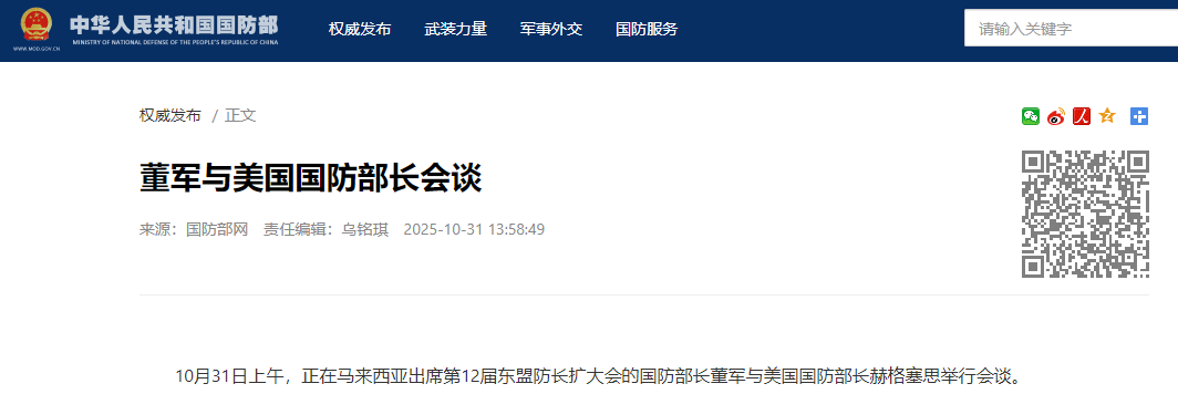 香港中通社10月31日電 10月31日,正在馬來西亞出席第12屆東盟防長擴大會的中國國防部長董軍與美國國防部長赫格塞思舉行會談。董軍說,中美兩國防務部門要以實際行動落實好元首共識,發揮高層戰略溝通的示範帶動作用。