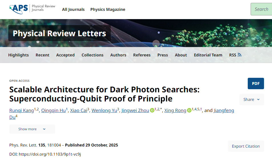 該研究成果10月29日發表於國際學術期刊《物理評論快報》(Physical Review Letters) 現代天文學與宇宙學觀測表明,暗物質約佔宇宙總質量25%。近年來,以軸子和暗光子為代表的超輕玻色子暗物質成為備受關注的暗物質候選者。理論預言,超輕暗物質的可能質量範圍約為1至100μeV,且與普通物質之間僅存在極微弱的相互作用。國際上已開展一系列超輕暗物質搜尋的實驗研究,但面臨測量範圍與探測靈敏度難以兼顧的技術挑戰。 該研究提出利用超導量子比特直接搜尋超輕暗物質的實驗架構。研究利用微納加工技術,在單個芯片上集成多個頻率可調的超導量子比特,形成可擴展的暗物質搜尋架構。這一架構可對暗物質多能區同步開展高靈敏掃描探測,有望解決測量範圍與靈敏度難以兼顧的問題。同時,研究設計製作了三比特超導量子芯片,可同時對三個能區的暗光子進行搜尋,並給出相應區間內最嚴格的暗光子-光子耦合界限。研究發現,實驗結果相較此前基於天文觀測的界限提升了1至2個數量級。
