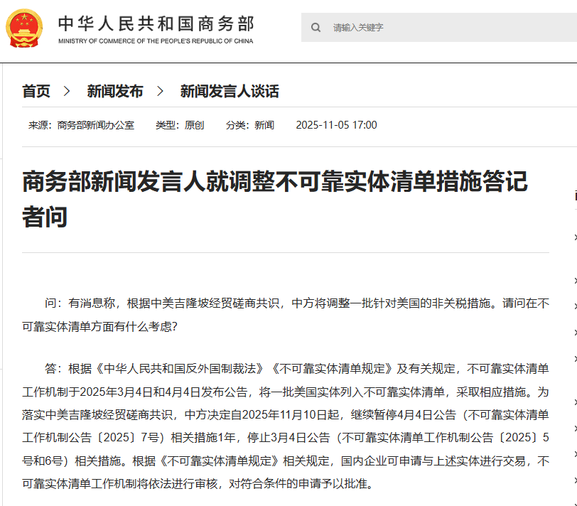 圖片來源:中國商務部網站截圖 據中國商務部網站消息,發言人表示,根據《中華人民共和國反外國制裁法》、《不可靠實體清單規定》及有關規定,不可靠實體清單工作機制於今年3月4日和4月4日發布公告,將一批美國實體列入不可靠實體清單,採取相應措施。為落實中美吉隆坡經貿磋商共識,中方決定自今年11月10日起,繼續暫停4月4日公告(不可靠實體清單工作機制公告〔2025〕7號)相關措施1年,停止3月4日公告(不可靠實體清單工作機制公告〔2025〕5號和6號)相關措施。 根據《不可靠實體清單規定》相關規定,國內企業可申請與上述實體進行交易,不可靠實體清單工作機制將依法進行審核,對符合條件的申請予以批准。(完) 【編輯:林曉惠】