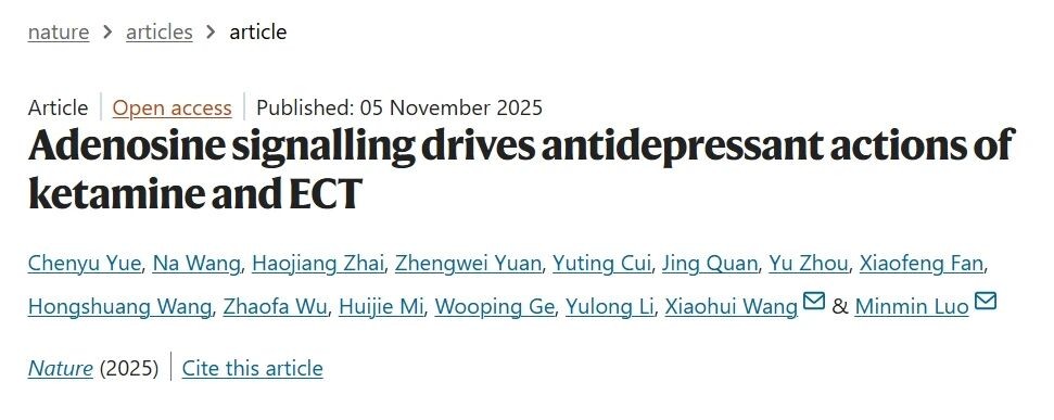 圖源:國際頂級期刊《自然》網站截圖 目前,全球約有三分之一的抑鬱症患者屬於“難治性抑鬱症”,對傳統藥物反應不佳。氯胺酮和ECT是主要干預手段,雖可在數小時內起效,卻伴隨致幻、成癮及認知損傷等嚴重副作用。由於機制不明,臨床應用長期處於“知其然不知其所以然”的困境。 羅敏敏團隊聯合中國多個頂尖實驗室,借助北京大學李毓龍團隊開發的基因編碼熒光探針技術,首次在活體動物大腦中觀測到:兩種療法均能迅速、持續提升情緒調控關鍵腦區的腺苷水平。