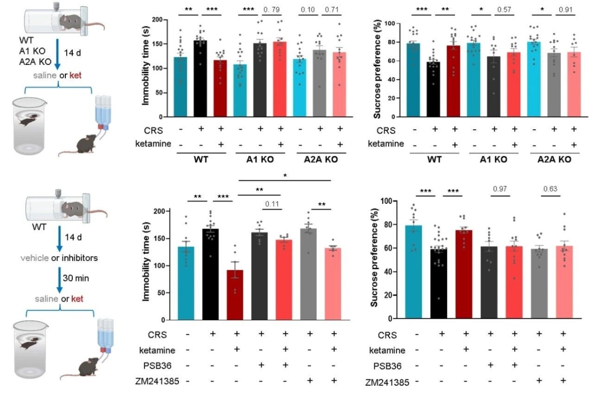 圖:氯胺酮(Ketamine)和電休克療法(ECT)誘導內側前額葉皮層腺苷激增 圖源:北京腦科學與類腦研究所 為驗證因果關係,團隊通過遺傳學與藥理學實驗進一步證實,關閉腺苷受體後,兩種療法的抗抑鬱效果完全消失;而直接激活該通路則可產生明確療效。這表明腺苷不僅是相關因子,更是起效的“總開關”。