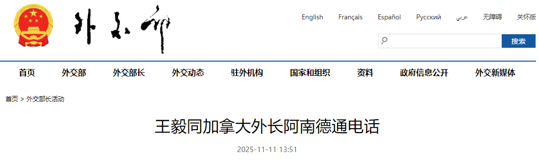 圖源:中國外交部官網截圖 據中國外交部官網消息,王毅表示,不久前,中加領導人在韓國慶州舉行了具有轉折意義的會晤,就中加關係改善發展的方向達成重要共識、作出戰略引領,標誌著中加關係在經歷7年波折後進入正確發展軌道。 王毅指出,落實好兩國領導人共識是中加關係當前最重要的議程。中方願同加方加強溝通,採取有效行動,加快恢復各領域交流合作,以務實和建設性方式鞏固中加關係進一步改善發展勢頭。兩國外交、商務等部門可加強對接,本著互諒互讓、友好協商的精神,妥善解決各自的合理關切,推動中加關係實現健康、穩定、可持續發展。 阿南德表示,兩國領導人一周多前在韓國慶州舉行了坦誠深入、富有成效的會晤,加中關係迎來重要轉折點。加方願同中方把握契機,加強各層級各領域對話溝通,增進理解與互信,重振加中戰略夥伴關係,在貿易、領事、禁毒、能源等領域達成更多互利成果,共同落實好兩國領導人重要共識。(完) 【編輯:彭玉婷】