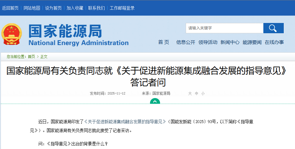 圖片來源:中國國家能源局官網截圖 據國家能源局官網12日消息,《意見》指出,“十四五”以來中國新能源裝機規模已歷史性超過火電,但隨著滲透率持續提高,系統消納壓力加大、土地等要素約束趨緊,亟需轉變開發模式。為此,文件從多維度部署重點任務:一是推動“沙戈荒”大基地、水風光一體化及100%新能源示範區建設,優化電源結構與儲能配置;二是強化空間集約利用,鼓勵交通、建築、農村、海島等場景分布式新能源融合開發,推廣“光儲充換”、“光儲直柔”等新模式;三是加快虛擬電廠規模化發展,提升新能源“可觀、可測、可調、可控”水平,打造系統友好型電站。 在產業協同方面,《意見》強調推進“以綠制綠”,支持新能源裝備製造使用綠電,打造零碳園區;引導高載能產業向新能源富集區轉移,實現“西電西用”;結合“東數西算”,推動算力與電力協同布局。同時,積極拓展非電應用,穩步建設綠色氫氨醇綜合產業基地,鼓勵海上風電制氫及航運綠色燃料加注,並在工業園區推廣新能源供熱供冷,探索地熱、風光、生物質多能互補供暖。 為保障實施,《意見》要求優化項目審批、電網接入和電力調度機制,完善綠電交易、容量補償及綠色認證體系,支持地方政府專項債傾斜,加快形成可複製、可推廣的集成融合示範項目,為中國式現代化提供綠色能源支撐。(完) 【編輯:林曉惠】