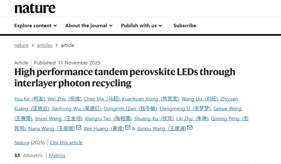 該成果11日發表於國際學術期刊《自然》(Nature) 綜合南京工業大學公眾號12日消息及中國《科技日報》13日刊登的報道,該研究由中國科學院院士、柔性電子全國重點實驗室主任黃維領銜的科研團隊進行。 發光二極管技術能够直接將電能轉化為光能,近年來在照明與顯示等領域展現出廣闊應用前景。鈣鈦礦LED因其兼具可溶液加工、色純度高、製備成本低等優勢備受關注,其性能已逐步接近商業化有機LED水平。目前,商業化有機LED顯示屏幕普遍採用疊層器件結構。然而,當前疊層鈣鈦礦LED的外量子效率仍不足10%,甚至遠低於單結器件,嚴重制約其商業化進程。