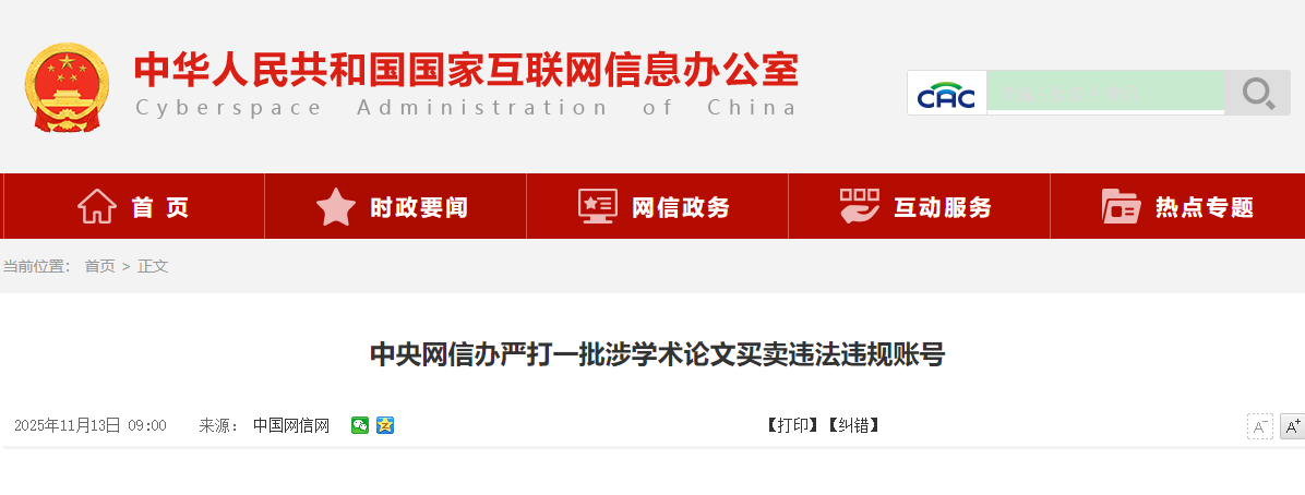 圖源:中央網信辦網站截圖 據介紹,第一類典型案例是明碼標價實施學術論文買賣行為。網絡賬號“琪瑞派論文諮詢”“蘇蘇老師論文輔導諮詢”“本碩博畢業服務旗艦店”等,利用“畢業論文全天加急”“文章代筆”“輔導至畢業”等宣傳營銷話術,明碼標價提供學術論文買賣、代發、代投服務。上述賬號已依法予以關閉。 第二類典型案例是引流圈群實施學術論文買賣行為。網絡賬號“木木學姐論文諮詢”“GYuan-論文指導”“A1孫編輯”等,以“論文輔導”“期刊諮詢”“論文降重”等隱晦話術,誘導用戶添加微信、QQ等私域圈群聯繫方式,違規提供學術論文買賣、代發、代投服務。上述賬號已依法予以關閉。 第三類典型案例是利用話題暗示提供違規服務。網絡賬號“司徒說創業”“官子隨筆”等,發布“AI代寫業務招商”“招募兼職寫手”等話題,在其簡介、評論互動等環節暗示提供學術論文買賣、代發、代投服務。上述賬號已依法予以關閉。(完) 【編輯:彭玉婷】