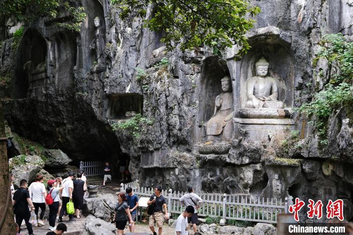 遊客到訪參觀杭州飛來峰(中新社) 據公開資料,杭州素有東南佛國美譽,靈隱飛來峰景區是馳名海內外的佛教聖地。靈隱寺作為中國十大古刹之一,始建於東晉,距今已有1700多年歷史,香火鼎盛。飛來峰的崖壁間則鐫刻有歷代的390餘尊石窟造像和300餘品摩崖題刻。飛來峰造像題材多樣,風格獨特,自五代至元、明時期皆有開鑿,形象包含羅漢、金剛手、寶藏神、文殊菩薩、布袋和尚、頂髻尊勝佛母等代表性神祇。(完) 【編輯:吳一帆】
