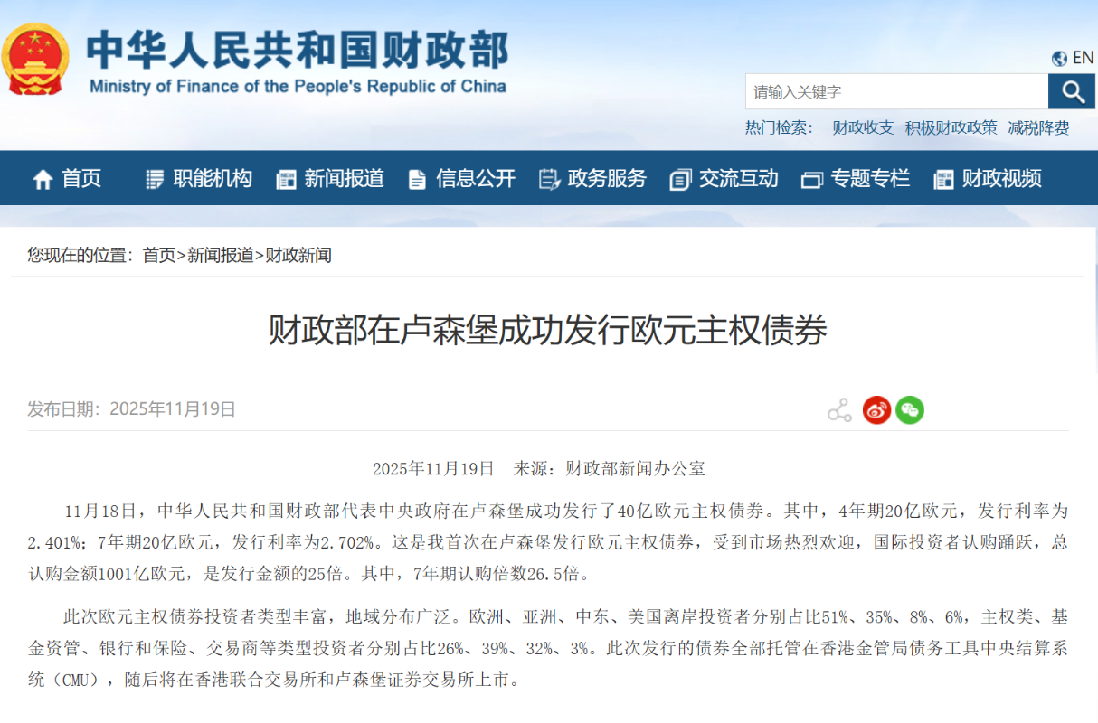 香港新聞網11月20日電 11月18日,中國財政部代表中央政府在盧森堡成功發行了40億歐元主權債券。其中,4年期20億歐元,發行利率為2.401%;7年期20億歐元,發行利率為2.702%。