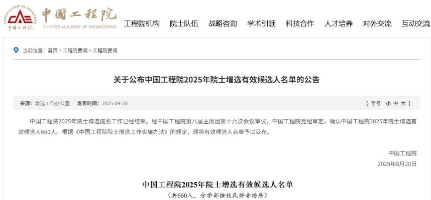 中國科學院網站視頻截圖 在新當選兩院院士中,女性科學家共13人。此外,2025年中國科學院新當選外籍院士27人,中國工程院新當選外籍院士24人。 本次增選後,中國科學院院士總數為908人,外籍院士總數為173人。其中,數學物理學部14人,化學部11人,生命科學和醫學學部13人,地學部9人,信息技術科學部11人,技術科學部15人。 新當選院士平均年齡57.2歲,最小年齡44歲,最大年齡66歲,60歲(含)以下的佔67.1%。 中國工程院院士總數為1002人,外籍院士總數為148人。 新當選中國科學院院士名單中,有5位女性學者當選。在新當選中國工程院院士名單中,有8位女性學者當選。(完) 【編輯:胡雪石】