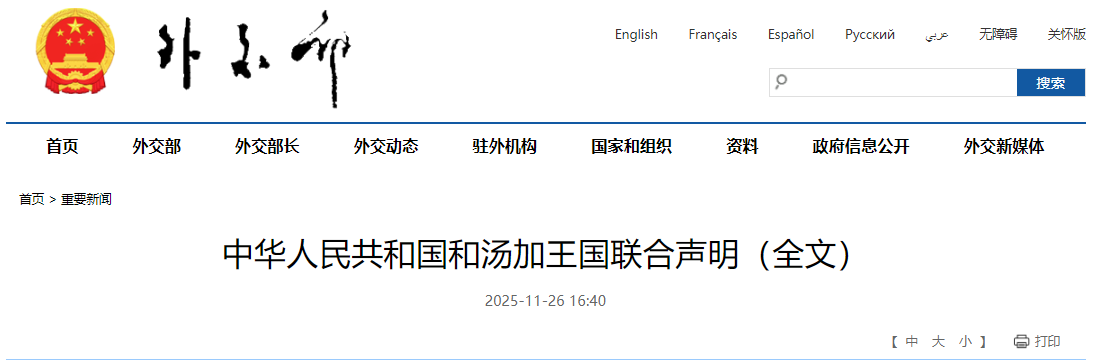 圖源:中國外交部網站截圖 應中國國家主席習近平邀請,湯加國王圖普六世於11月21日至27日對中國進行國事訪問。根據聯合聲明,湯方重申恪守一個中國原則,承認世界上只有一個中國,台灣是中國領土不可分割的一部分,中華人民共和國政府是代表全中國的唯一合法政府,堅決反對任何形式的“台灣獨立”,堅定支持中國政府實現國家統一,認為聯合國大會第2758號決議的權威性不容質疑和挑戰。湯方堅定支持中方在涉港、涉藏、涉疆、人權等問題上的立場。 此外,湯方支持習近平主席提出的全球治理倡議,認為在世界反法西斯戰爭勝利和聯合國成立80周年之際,這一重要倡議正逢其時,有助於推動構建更加公正合理的全球治理體系。湯方重申支持全球發展倡議、全球安全倡議、全球文明倡議。雙方一致同意加強在國際和地區事務中溝通協作,弘揚和平、發展、公平、正義、民主、自由的全人類共同價值,捍衛以聯合國為核心的國際體系、以國際法為基礎的國際秩序、以聯合國憲章宗旨和原則為基礎的國際關係基本準則,維護以世界貿易組織為核心的多邊貿易體制,反對霸權主義和強權政治,推動平等有序的世界多極化、普惠包容的經濟全球化。 雙方還高度評價高質量共建“一帶一路”豐碩成果,同意拓展貿易投資、農林漁業、基礎設施、清潔能源等廣泛領域務實合作,並擴大教育、醫療、旅遊、體育、青年、媒體、地方等領域交往合作,持續增進民心相通。(完) 【編輯:彭玉婷】