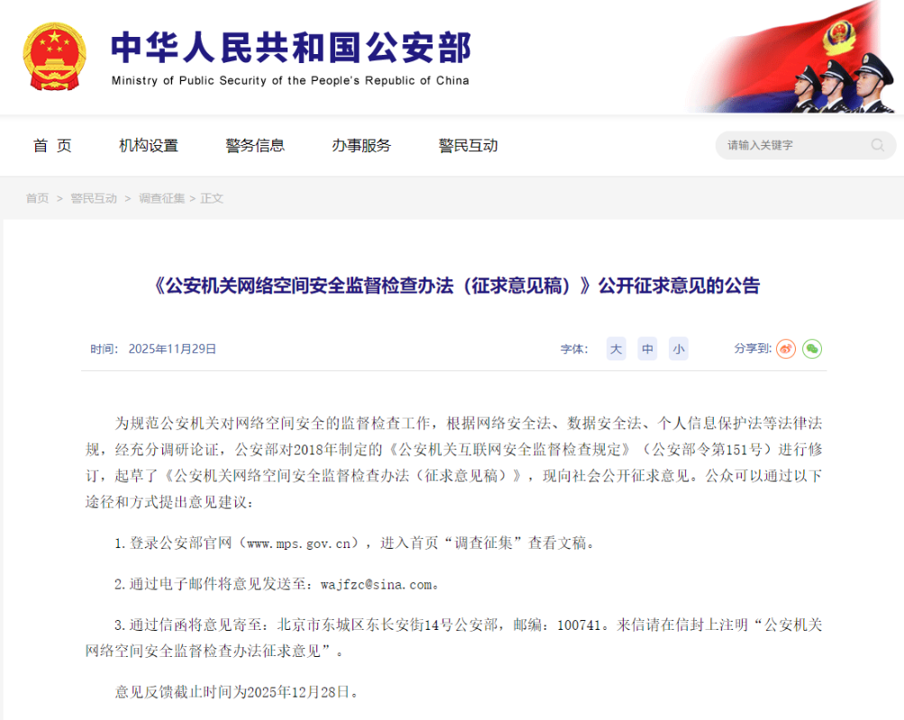 圖源:中國公安部網站截圖 徵求意見稿指出,本辦法適用於公安機關依法對網絡運營者、數據處理者、個人信息處理者等履行法律法規規定的網絡安全、信息安全、數據安全義務情況開展的監督檢查。 公安機關根據網絡空間安全防範需要,可以對下列8種對象依法開展監督檢查,包括提供互聯網接入、數據中心、內容分發、域名服務、信息服務等的互聯網服務提供者,公共上網服務提供者,網絡運營者及其建設者、維護者,關鍵信息基礎設施運營者及其建設者、維護者,網絡產品、服務的提供者,數據處理者,個人信息處理者,及其他依法可以監督檢查的對象。 徵求意見稿明確,公安機關開展網絡空間安全監督檢查,不得幹擾被檢查對象的正常運營。公安機關對網絡安全等級保護三級以上的網絡運營者、關鍵信息基礎設施運營者,應當每年開展一次現場檢查。 另外,受公安機關委託提供技術支持的網絡安全服務機構、專門人員,從事非法侵入被檢查對象網絡、干擾網絡正常功能、竊取網絡數據等危害網絡空間安全的活動,竊取或者以其他非法方式獲取、出售或者向他人提供在工作中獲悉的國家秘密、工作秘密、商業秘密、個人信息的,依法予以處罰;構成犯罪的,依法追究刑事責任。(完) 【編輯:彭玉婷】