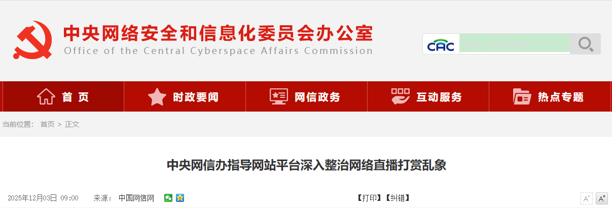 香港中通社12月3日電 據中共中央網絡安全和信息化委員會辦公室(中央網信辦)12月3日消息,“清朗·整治網絡直播打賞亂象”專項行動啟動一個月以來,中央網信辦指導督促網站平台,緊盯低俗團播引誘打賞、虛假人設誘騙打賞、誘導未成年人打賞和刺激用戶非理性打賞等突出問題,持續加大清理處置力度,完善打賞規則和管理制度,規範直播打賞營利行為。
