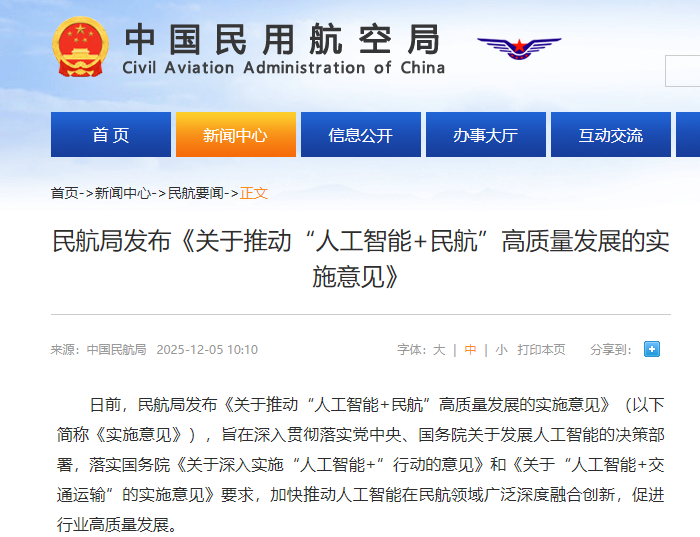 圖源:中國民航局官網截圖 《實施意見》提出,到2027年,率先實現人工智能與民航安全、運行、出行、物流、監管、規劃建設等領域融合發展,民航人工智能核心支撐要素建設初見成效;到2030年,實現人工智能與民航各領域廣泛深度融合,民航人工智能治理體系和安全保障體系逐步完善,人工智能成為推動民航高質量發展的強勁引擎。 《實施意見》圍繞安全、運行、出行、物流、監管、規劃建設等六大重點領域,結合民航發展需求與人工智能技術優勢,系統梳理了“人工智能+民航”創新賦能場景,提出了安全風險預警、運行智能優化、旅客便捷服務、物流提質增效、監管精準決策等方面的智能化應用場景框架,並基於實踐應用的成熟度,在附件中對具有較高推廣前景的42項具體應用場景作了細化,以便進一步指導具體工作。(完) 【編輯:彭玉婷】
