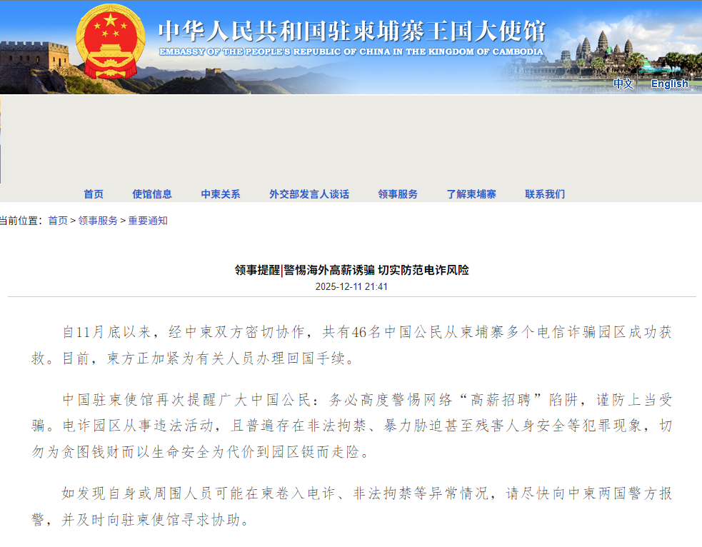 圖源:中國駐柬埔寨大使館官網截圖 中國駐柬使館再次提醒廣大中國公民:務必高度警惕網絡“高薪招聘”陷阱,謹防上當受騙。電詐園區從事違法活動,且普遍存在非法拘禁、暴力脅迫甚至殘害人身安全等犯罪現象,切勿為貪圖錢財而以生命安全為代價到園區鋌而走險。 中國駐柬使館表示,如發現自身或周圍人員可能在柬捲入電詐、非法拘禁等異常情況,請盡快向中柬兩國警方報警,並及時向中國駐柬使館尋求協助。(完) 【編輯:彭玉婷】
